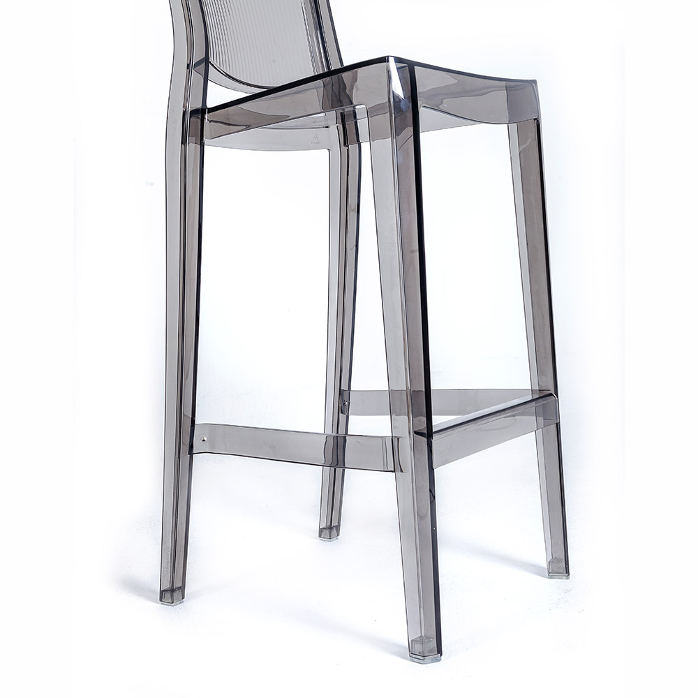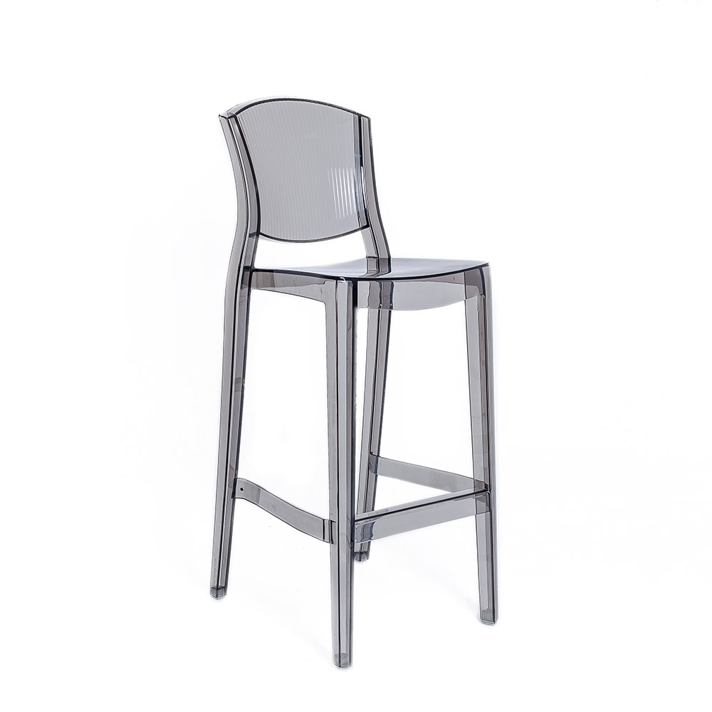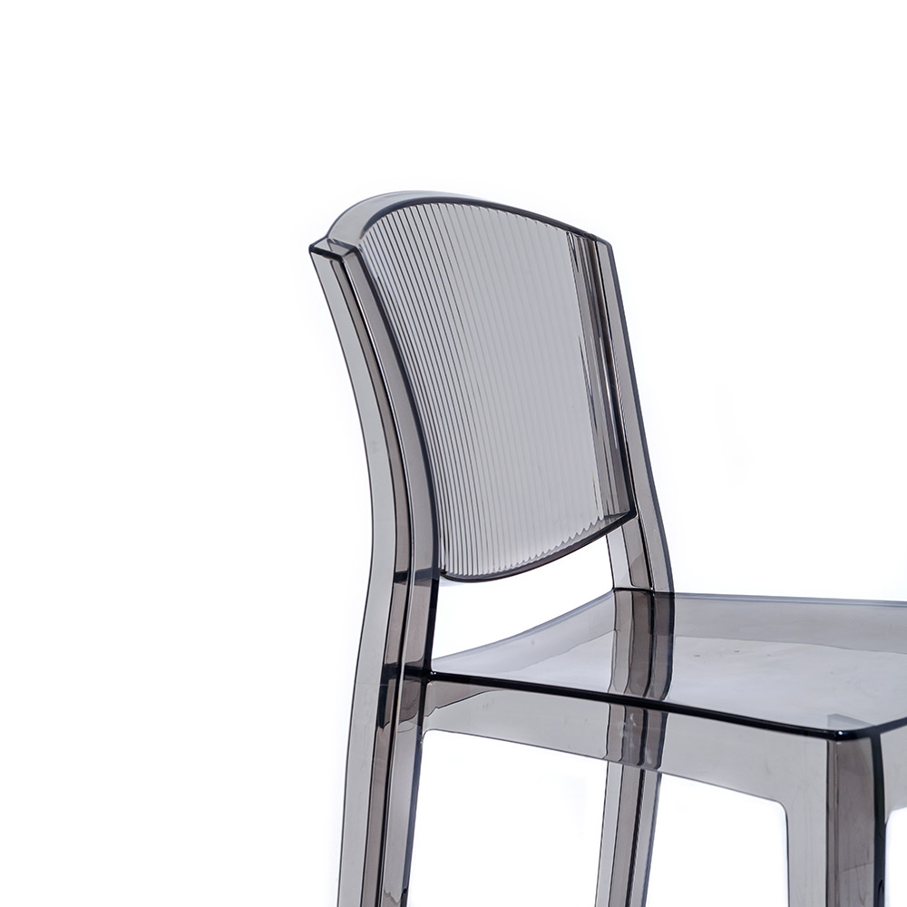 La silla alta Magnolia está hecha de policarbonato y cuenta con un respaldar con canaletas rayadas. Su color único, un gris oscuro pero transparente, la hace perfecta para eventos elegantes y de noche.