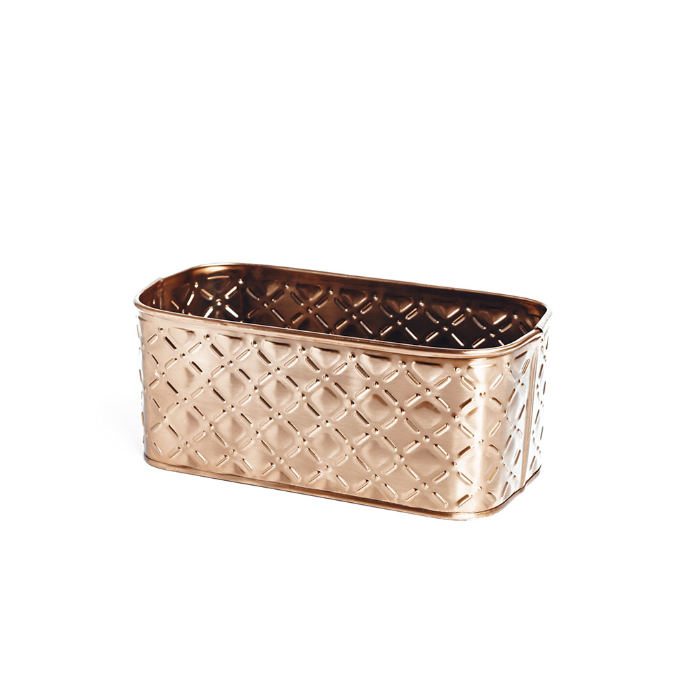 La canasta Rania con diseño rectangular, textura y color dorado es ideal para tostaditas o panes. También la puedes rellenar con flores como centro de mesa.