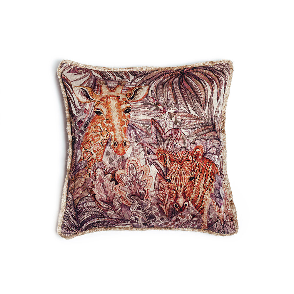 El cojín Maeve nos remonta a la savannah africana por sus colores y detalles de animales de safari. Combínalo con otros cojines de colores enteros y diferentes texturas para crear una combinación única.