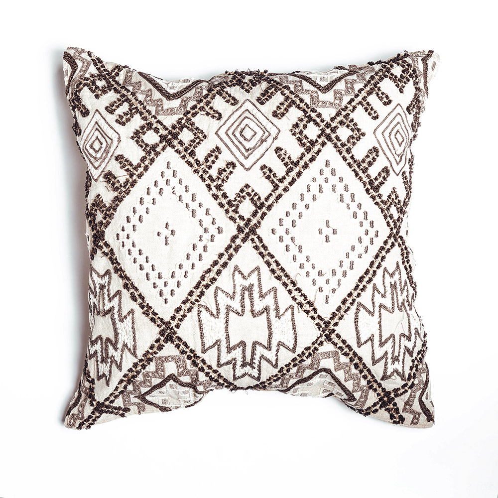 El cojín Ravinia, con colores tierra tiene un diseño tribal que le dará un toque exótico a cualquier composición.