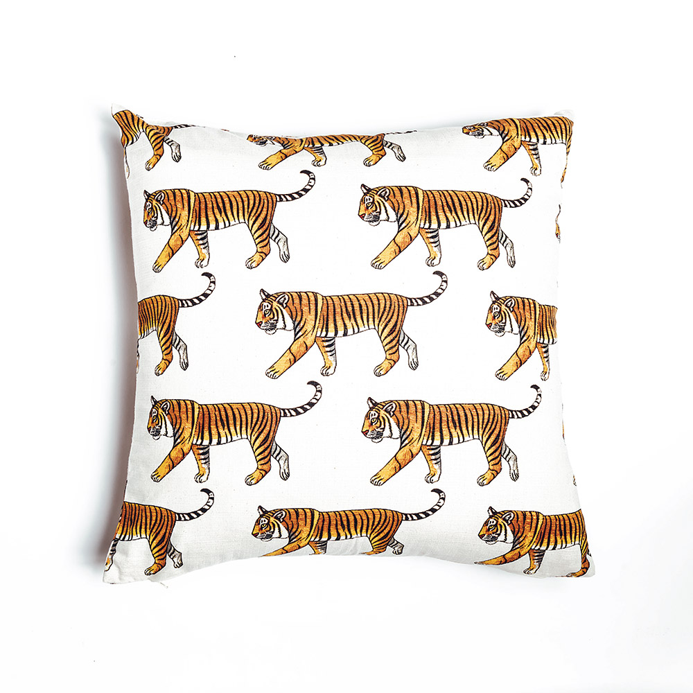 El cojín Zabre tiene un diseño de tigres que combinará perfecto con gamas de color naranja, amarillos y neutros. Combínalo con nuestros cojines indios para darle atención al animal originario de este país.
