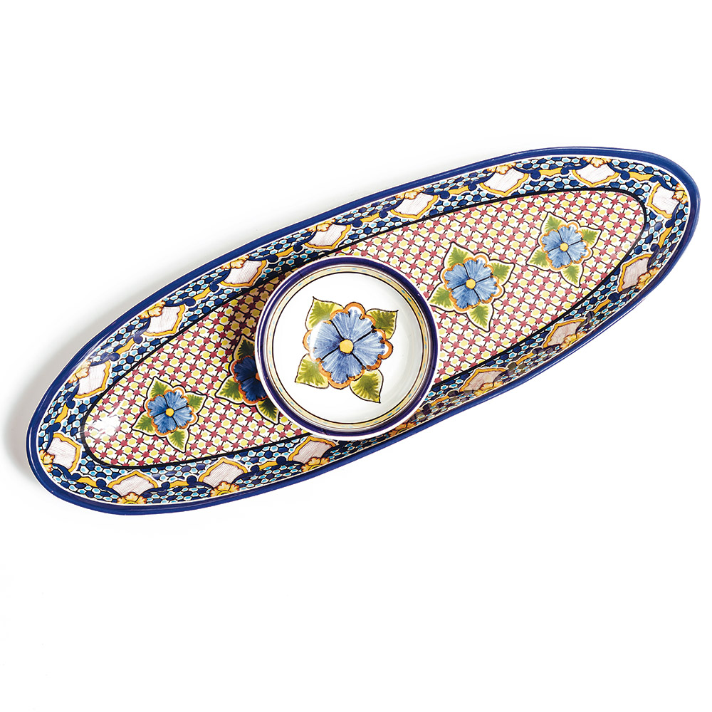 La fuente Yucatán es ideal para una fiesta mexicana por su estilo colorido. Perfecto para pasar bocaditos con una salsa para acompañar.