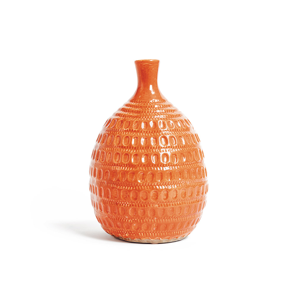 El jarrón Guadalupe, fabricado de cerámica pintada en color naranja brillante, avivará cualquier centro de mesa.