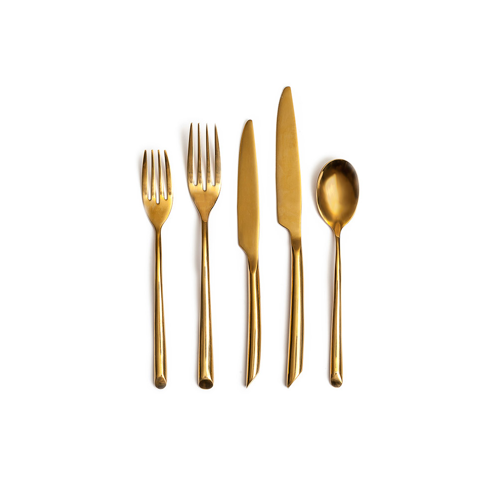 Nuestro set de cubiertos Saturno en color dorado denota elegancia y modernidad.