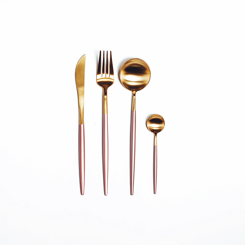 Nuestro set de cubiertos Venus tiene una combinación de colores dorado y palo rosa que denotan elegancia y modernidad.